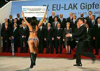 Evangelina Carrozo protesta por el establecimiento de pasteras en Gualeguaychú frente a los líderes del G20. Detalle sobre la cara de Tony Blair, abajo, a la izquierda. |